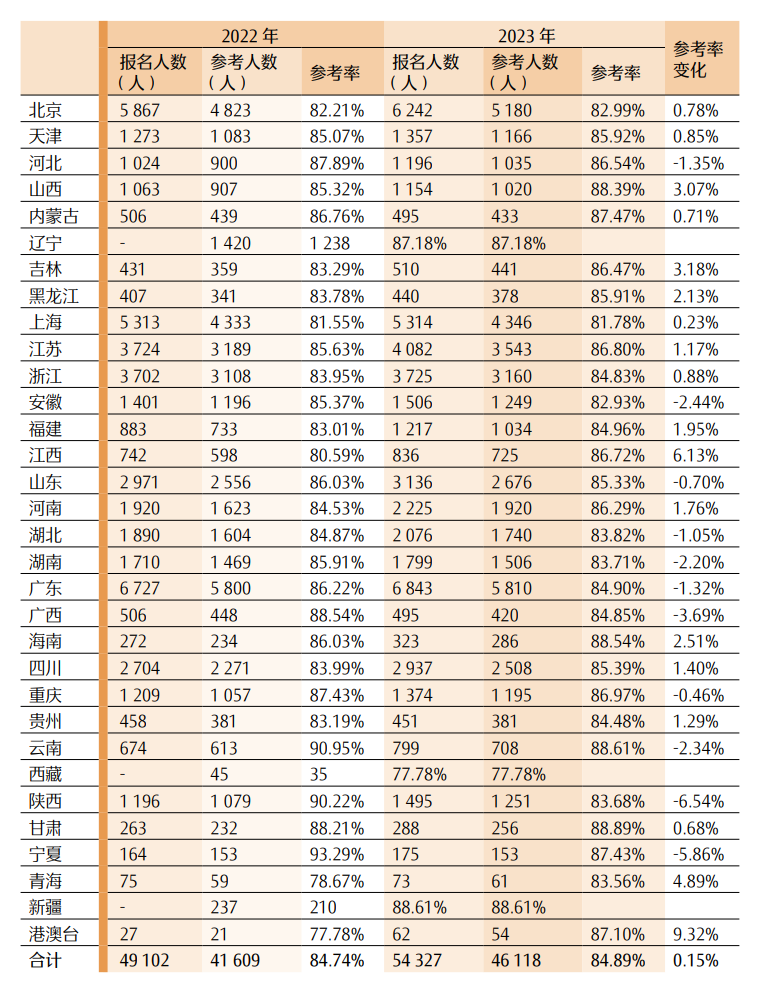 表 82022—2023年各地专业阶段考试报名和参考情况一览表