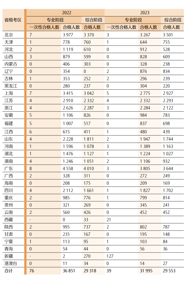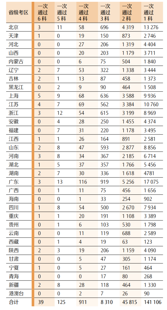表 132023 年各地专业阶段一次性通过科目数量情况一览表
