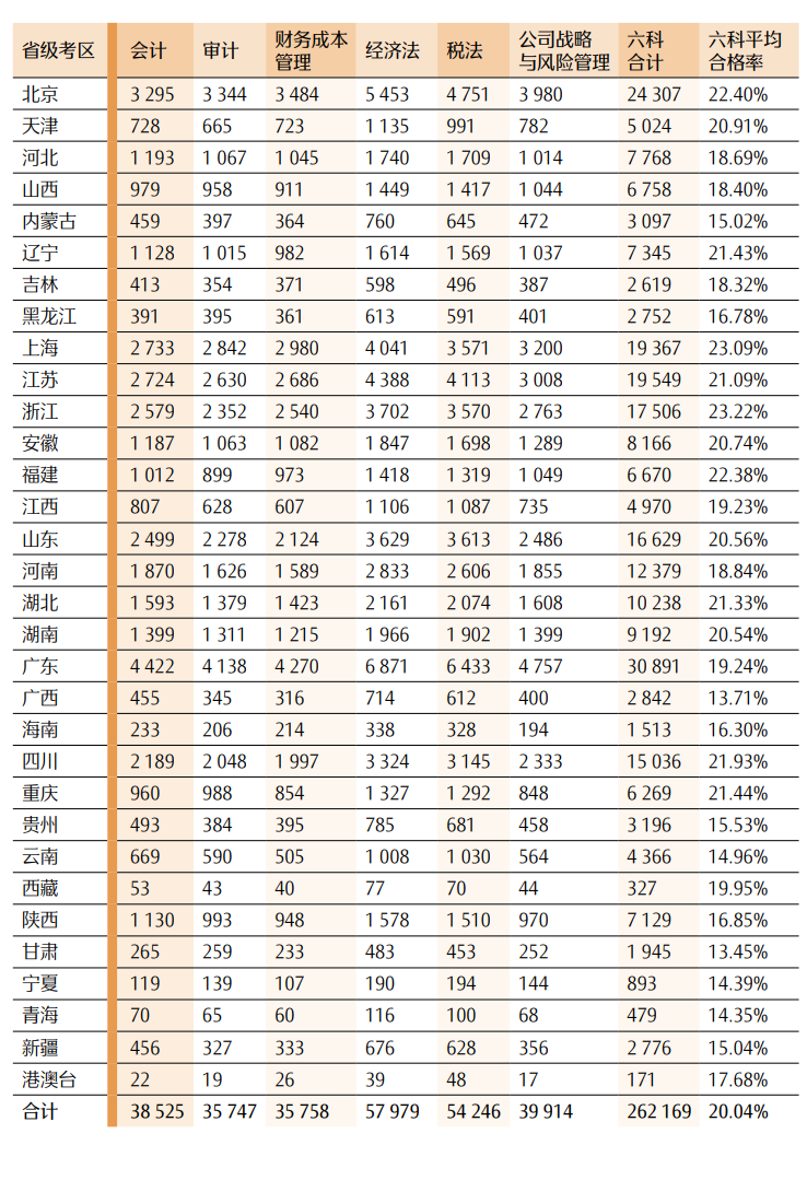 表 122023 年各地专业阶段考试 6个科目合格情况一览表