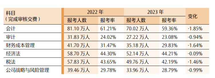 数据显示,专业阶段 6 个科目中,报考会计科目的人数最多,达到 70.02 万人,报考率(报考某科目人数占报考专业阶段考试总人数的比例)为 59.36%。紧随其后的是经济法和税法两个科目,分别为52.14 万人和 49.76 万人,报考率分别为 44.21% 和42.19%。审计科目报考人数最少,为 27.22 万人,报考率仅为 23.08%。各科目报考率与 2022 年相比均呈不同程度下降。具体情况详见表 4。