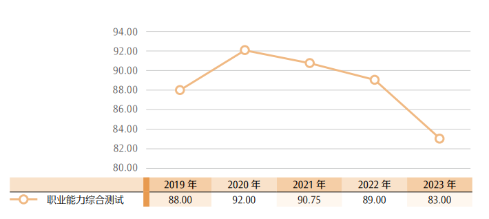 注册会计师考试专业阶段六个科目考试的平均分介于 39—50 之间。其中,会计科目的平均分最低,为39.04 分,经济法科目的平均分最高,为 49.69 分。综合阶段职业能力测试平均分为 60.38 分。具体情况详见表 21。