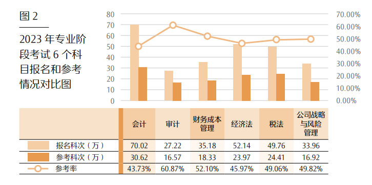 数据显示,6个科目中,会计科目报名人数最多,但参考率最低 ;审计科目报名人数最少,但参考率最高。具体情况详见表 7、图 2。表72023 年专业阶段考试 6 个科目报名和参考情况对比表