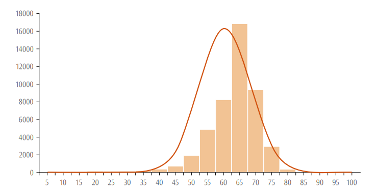 综合阶段考试职业能力综合测试的偏度值小于 0,呈负偏态,说明高于平均分的考生比低于平均分的考生人数多。职业能力综合测试的峰度值为7.2733。具体情况详见表 20、图6、图 7。