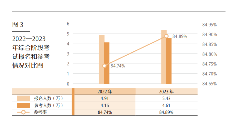 2. 综合阶段考试。2023 年综合阶段考试有 5.43 万人参考,较 2022 年提高了 10.60%,参考率达到 84.89%,较 2022 年提高了0.15%,远高于专业阶段考试 6 个科目的平均参考率(48.76%),表明参加综合阶段考试的考生对考试的投入程度及备考充分性上明显高于参加专业阶段考试的考生。具体情况详见图 3。