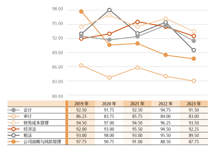 从2019 年—2023 年各科目考试成绩的统计情况看,专业阶段考试各科目的最高分数段基本保持在 83 分—98 分之间,其中,会计科目最高达到 94.75 分(2022 年),审计科目最高达到 86.25 分(2019 年),财务成本管理科目最高达到 97 分(2020 年),经济法科目最高达到 95.5 分(2021 年),税法科目最高达到 98 分(2020 年),公司战略与风险管理科目最高达到 97.75 分(2019 年)。而综合阶段考试的最高分数段基本保持在 83 分—92 分之间,其中 2020年出现了最高分,达到 92 分。具体情况详见图 13、图 14。
