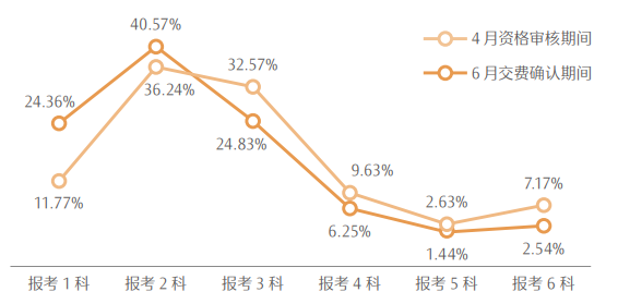数据显示,2023年考生在选择报考科目数量方面逐渐回归理智,一次性报考 3 个科目及以上的情形呈现明显下降。具体情况详见表 3、图 1。