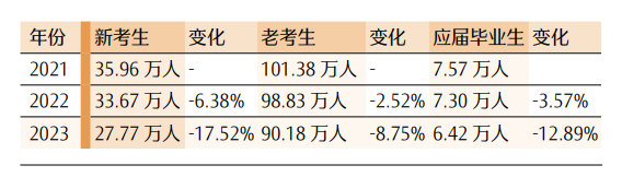 表 22021—2023年新考生、应届毕业生人数变化对照表