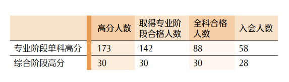 数据显示,专业阶段单科高分通过且取得全科合格的 88人中,专业阶段 6 科的平均分主要集中在 75 分—80 分、综合阶段分数则主要集中在 65 分—75 分。而综合阶段高分通过的 30 人中,专业阶段 6 科的平均分主要集中在 75 分—80 分。表明这些高分考生的基础知识较为扎实,且具备较好的解决实务问题的能力。具体情况详见表 27、表 28。