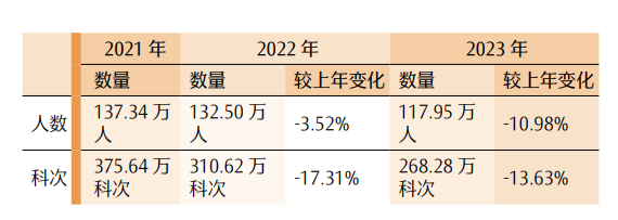 表 12021—2023年专业阶段考试报名(人数、科次)对照表