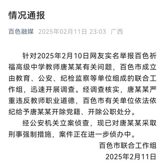 据央视新闻此前报道,针对2月10日网上关于百色祈福高级中学教师唐某某涉嫌师德失范行为的举报信息,百色市公安局、教育局等相关部门高度重视,第一时间联合成立专门工作组,进驻学校开展调查核实。