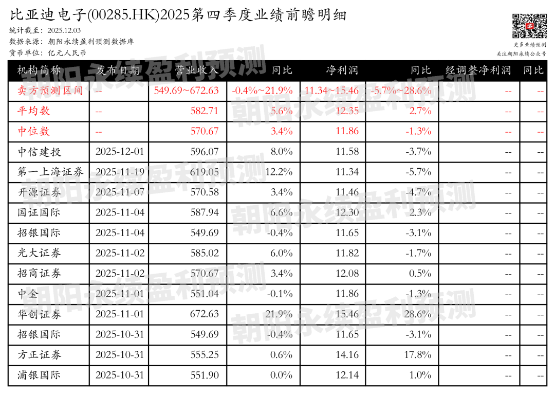 截至2025年12月03日,根据朝阳永续季度业绩前瞻数据: